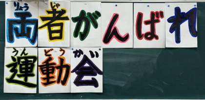 美化委員会で運動会のスローガン「両者がんばれ運動会」を作成しました。