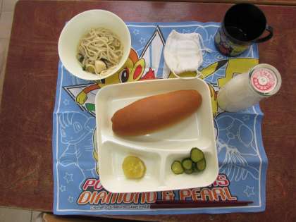 本日の給食の献立をご紹介します。本日の献立は、黒糖パン、みそラーメン、きゅうりの辛味漬け、焼きサツマイモの甘蜜かけ、牛乳でした。