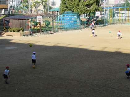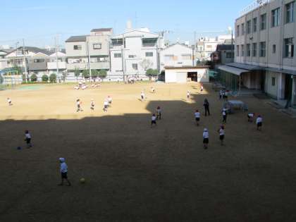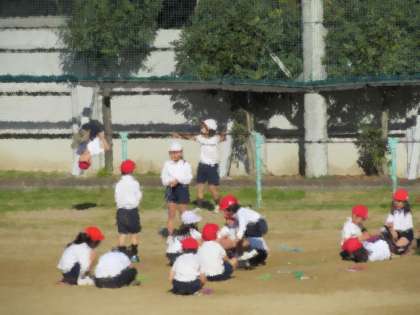 1年生の学習の様子をご紹介します。1年生が運動場で、体育をしています。ボール遊びをしているクラス、鉄棒遊びをしているクラスがあります。