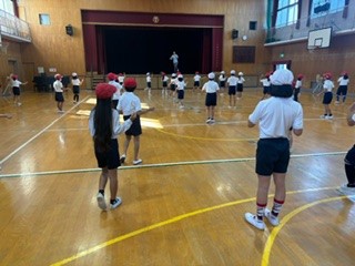 1時間目は、講堂でダンスのポーズの確認をしました。