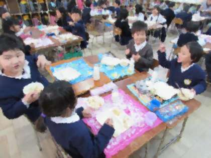 1年生の給食の様子をご紹介します。1年生の子どもたちも食べる量が増え、おいしく楽しくいただいています。