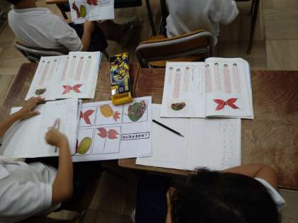 葉っぱを組み合わせた形を見て何に見えるのかを考え、相手に話すことを考えました。