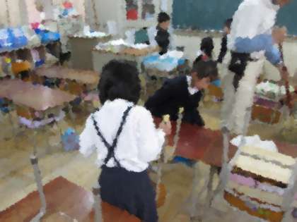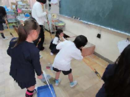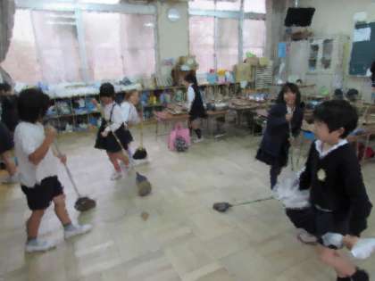 給食が終わって、清掃の時間です。1年生も、分担の場所を一生懸命に掃除しています。