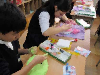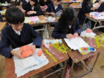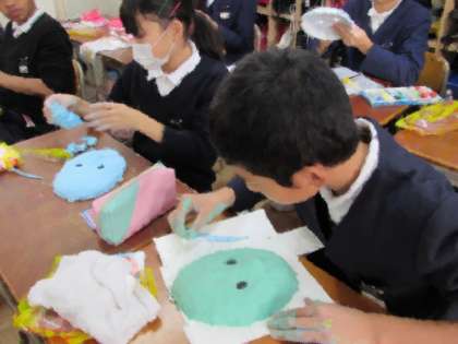 6年生の学習の様子をご紹介します。6年生が図画工作で、お面を作っています。今日は芯材に紙粘土を貼りつけ、「鬼」の面づくりに取り組んでいます。