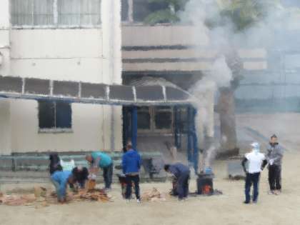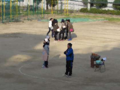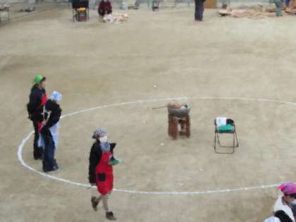 本日、千本小学校の校庭で、子ども会のもちつき大会が行われます。朝早くから、地域・保護者の皆さんが、校庭で準備をされています。もうすでに、待っている子どもたちもいます(画像下)。