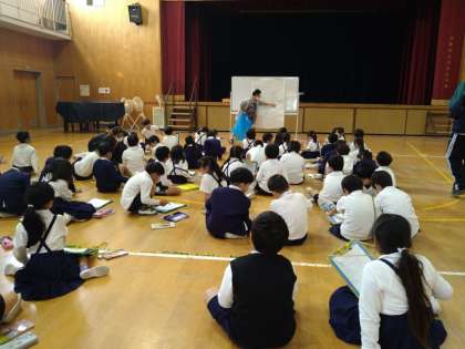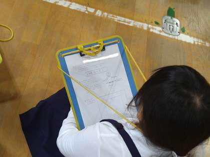 大きなカラーゴミ袋をつかって、どんなベストを作ろうか考えています。