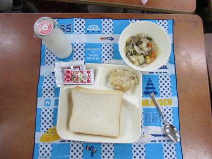 本日の献立は、食パン、いちごジャム、豆腐ハンバーグ、スープ煮、固形チーズ、牛乳でした。