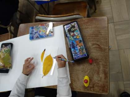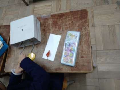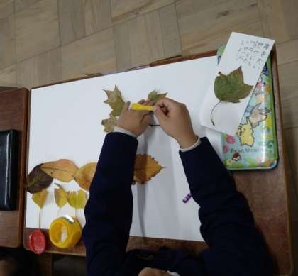 落ち葉を使って本のしおりを作ったり、画用紙に落ち葉を貼ったりしました。