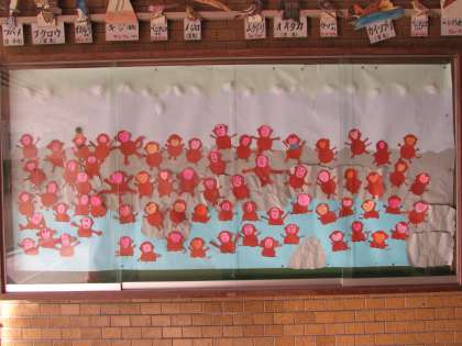 1月になり、玄関掲示が変わりました。1月の玄関掲示は、2年生の作品です。「申年」にちなみ、猿たちが温泉につかって、気持ちよさそうにしている図になっています。