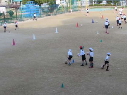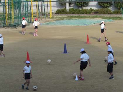 3年生の学習の様子をご紹介します。3年生が体育で、サッカーの練習に取り組んでいます。今日はコーンを並べ、ドリブルをしながら走る練習をしています。