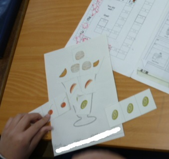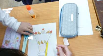 オリジナルパフェを作るために、先生に必要な材料をもらっています。