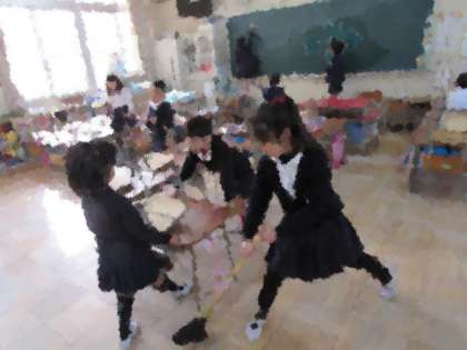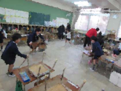 給食が終わって、全校一斉清掃です。1年生も(画像上・中)、6年生も(画像下)、一生懸命に掃除をしています。千本小学校の子どもたちの、素晴らしい面の一つです。
