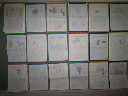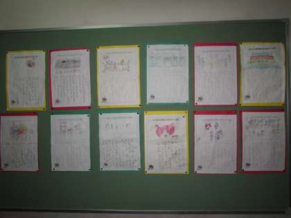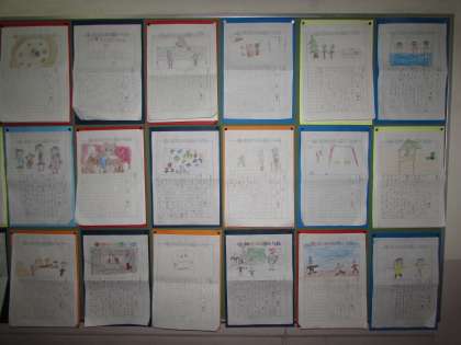 冬休みの楽しかった思い出を絵日記にして描いています。画像は1年生(画像上)と2年生(画像中・下)の作品です。