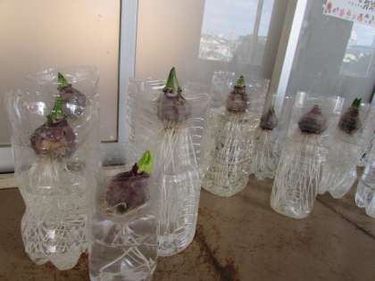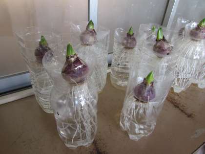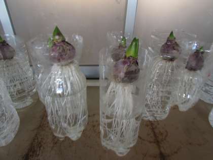2年生が水栽培をしているヒヤシンスです。芽が出るまでは、土の中と同じような状態にしておくのが良いということで、黒い紙を巻いていましたが、芽が伸びてきたということで、今日、その黒い紙を外しました。どの球根にも、大きな緑色の芽が出ています。子どもたちは、「早く花が咲かないかな」と、楽しみにしています。