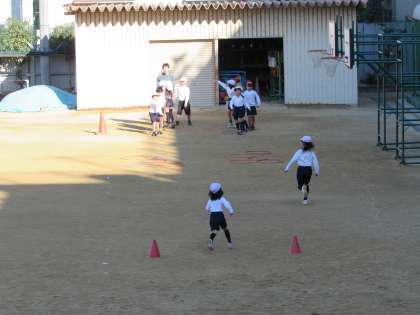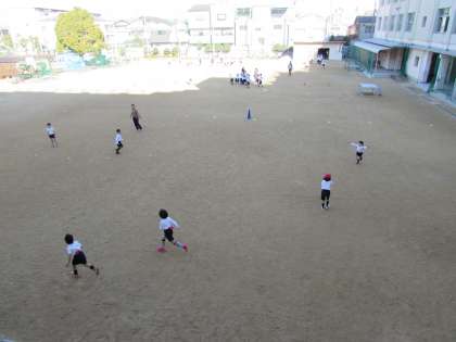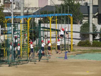 1年生の学習の様子をご紹介します。3クラス合同で、運動場で体育です。グループに分かれ、のぼり棒やおにごっこ、大縄、鉄棒やリレーに取り組んでいます。