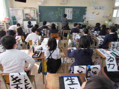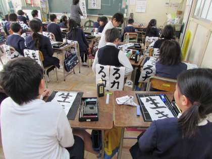 3年生の学習の様子をご紹介します。1組は、毛筆書写で、書き初めに取り組んでいます。今日は、書き終えた作品に、名前を書いています。