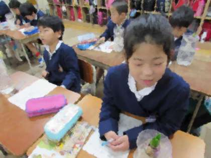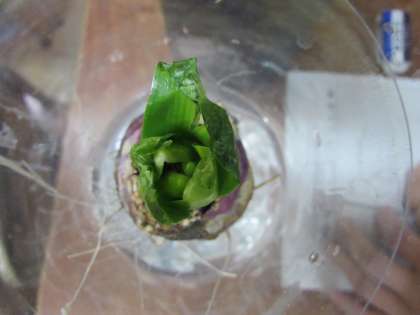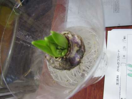 2年生が、生活科の学習で、ヒヤシンスの観察をしています。大きくなった芽を観察してみると、芽の先が開いてきていることに気づきました。