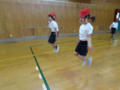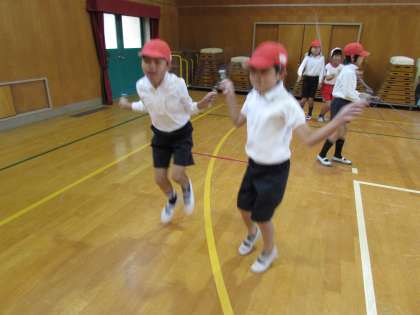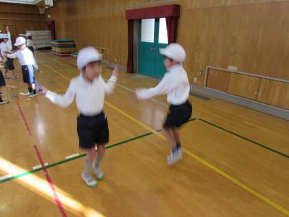 2年生の体育の様子をご紹介します。2年生が、体育館で体育をしています。今日は、なわとびに取り組んでいます。2人組になって、横に並び、それぞれのなわの一方を持って、跳んでいます。前回しをしたり、後ろ回しをしたり、並んだ2人が反対を向いて1人は前回し、1人は後ろ回しにチャレンジもしました。