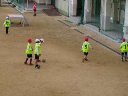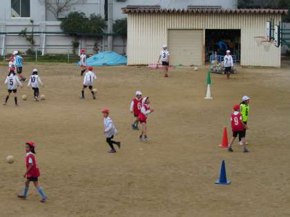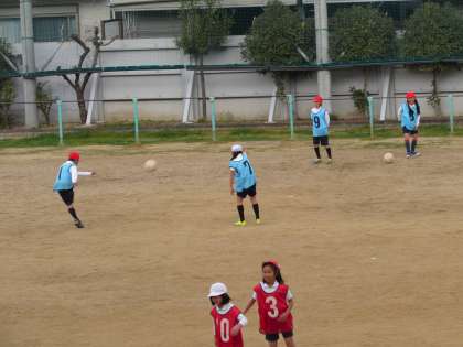 4年生が運動場で、体育をしています。サッカーの練習に取り組んでいます。