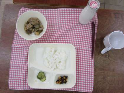 本日の給食の献立をご紹介します。本日の献立は、ご飯、筑前煮、ひじき豆、きゅうりのかつお梅風味、牛乳でした。