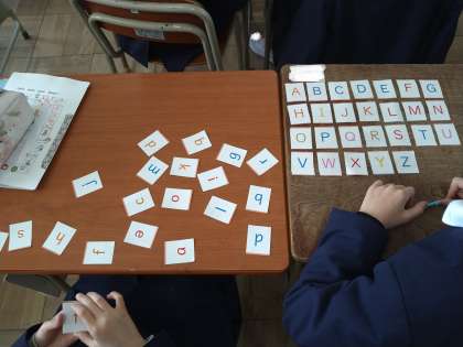 アルファベットカードをならべています。