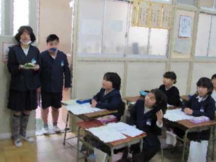 1月14日(木)に2年生が収穫した天王寺かぶらを、4年生が調理し、浅漬けにしました。今日、その漬物を4年生が2年生の教室に持ってきてくれました(画像上)。給食では、2年生と4年生がおいしくいただきました。ご飯によく合う、とってもおいしい漬物になっていました。