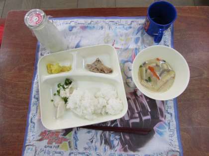 本日の給食の献立をご紹介します。本日の献立は、ご飯、かす汁、豚肉のごまだれ焼き、くりきんとん、牛乳でした。