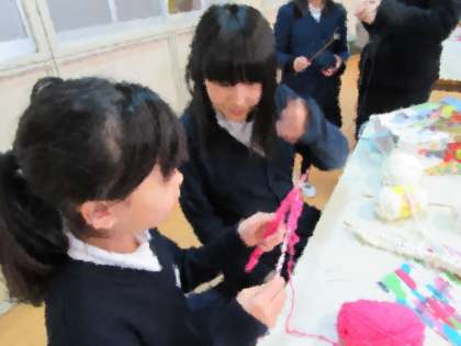 今日は、牛乳パックを使って、マフラー作りにチャレンジです。一つずつひっかけていって、編み進めています。