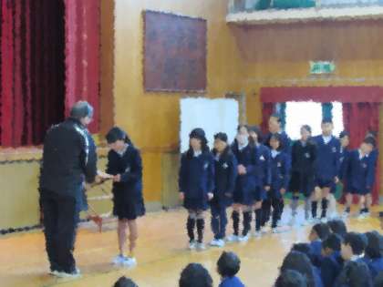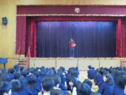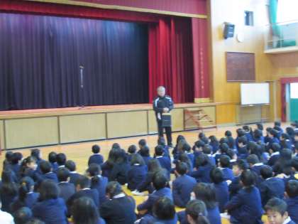 初めに、学校長からの話です。かぜやインフルエンザが流行る時期なので、手洗い・うがいをして、予防に努めましょう、という話、今週は給食強調週間です、給食の食べ残しをしないように頑張りましょう、という話がありました。