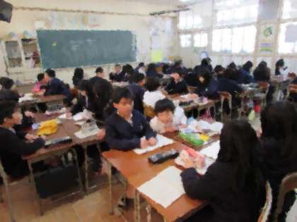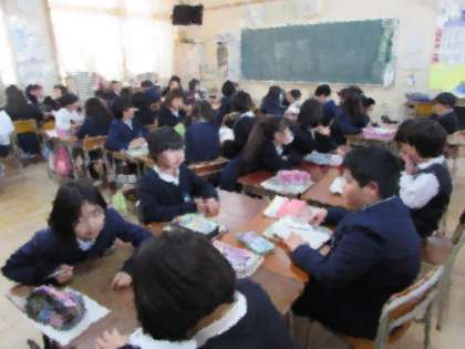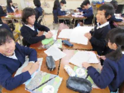 4年生の学習の様子です。1組は、理科の学習です。水が沸騰する温度について調べたことを、グループでまとめています。
