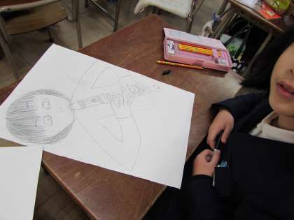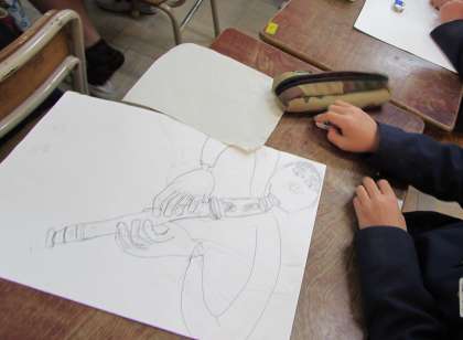 2組は図画工作の学習です。木版画の下絵を描いています。