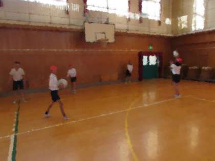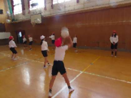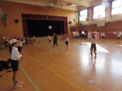 6年生の学習の様子をご紹介します。今日は体育館で、ソフトバレーボールに取り組んでいます。初めに、2人組で、オーバーパスの練習です。