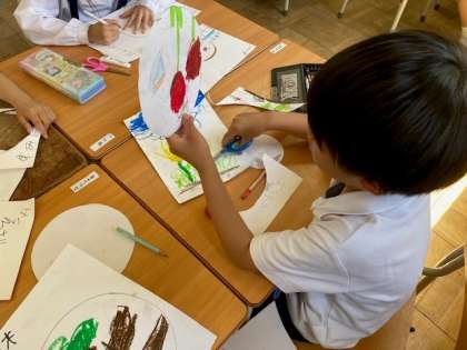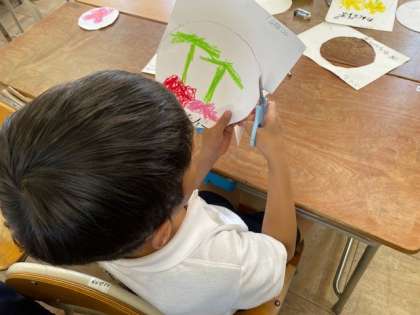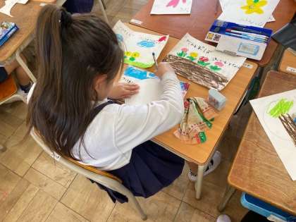 「春みつけ」でスケッチをしたものを切って教室や1回のろうかにかざりました。