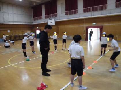 体力テストに向けて反復横跳びの練習をしています。成南中学校の先生のアドバイスを受けて頑張っています。