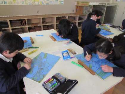 4年生の学習の様子です。図工室で、木版画を掘り始めました。初めての彫刻刀、手の位置に気を付け、けがをしないように彫っていきます。