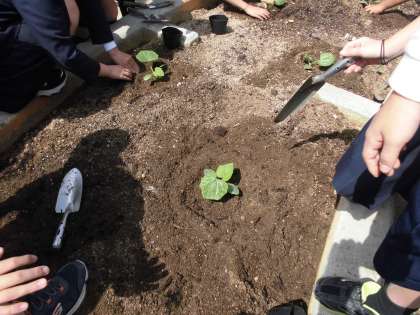 地域の方に教わり、古妻南京に教わって勝間南京を植えました。収穫できるのは9月ごろなので、それまで水やりなどのお世話をします。
