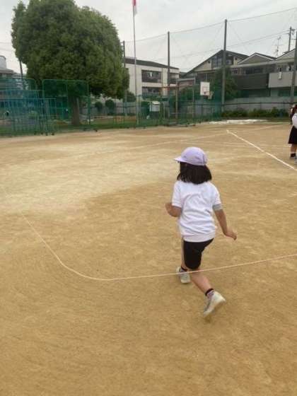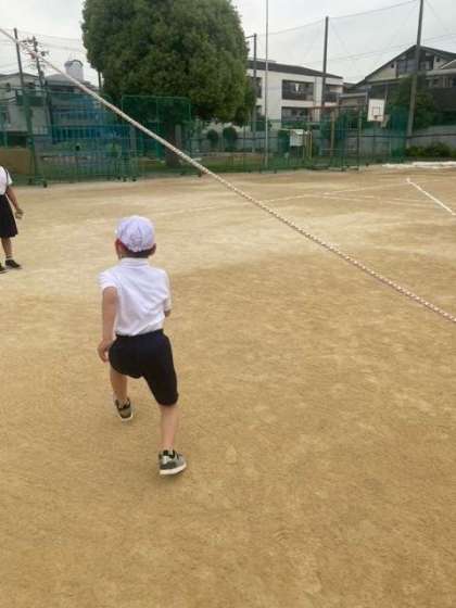みんなで大なわをしました。へび跳びや8の字跳びをしました。タイミングをはかって、上手に跳べました。