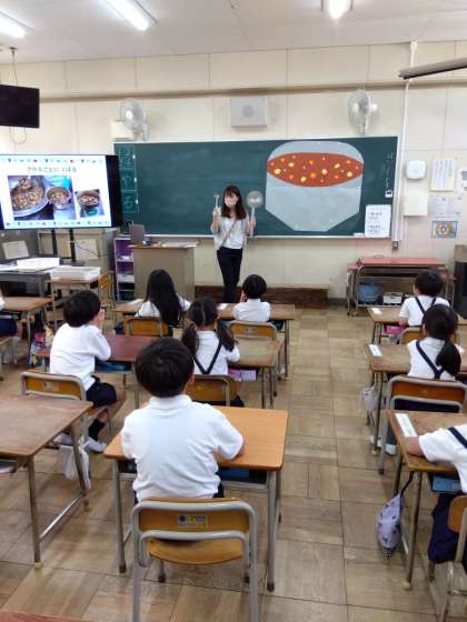 給食室の様子や、給食の約束について学習しました。給食室で使っている鍋やおたまの大きさにびっくり!手洗いの仕方もばっちりです。