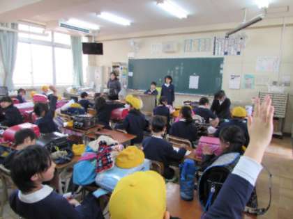 3年生の教室をのぞいてみました。5時間目が終わり、終わりの会をしています。頑張ったこと、また、友だちの頑張りで気づいたことなどを、発表しています。