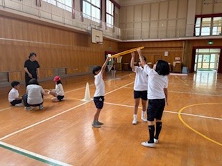 フラフープダウンでは、指一本しか使えず、みんなで支える難しさを感じながら、楽しく取り組めました。