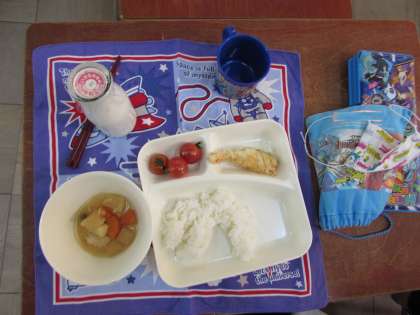 本日の給食献立をご紹介します。本日の献立は、ご飯、マダラのから揚げ、じゃがいもと野菜の煮物、プチトマト、牛乳でした。