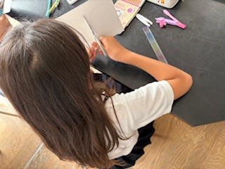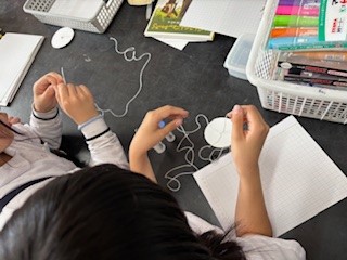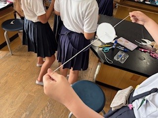 コンパスを使って円を描いたり、糸を通したりと難しい作業もありましたが、こまが完成するととても楽しそうでした。