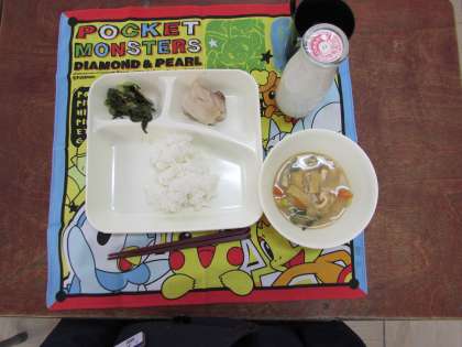 本日の給食献立をご紹介します。本日の献立は、ご飯、鶏肉のゆず塩焼き、みそ汁、おおさかしろなの煮びたし、牛乳でした。