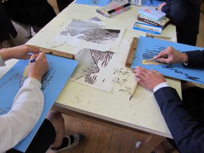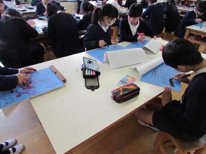6年生の学習の様子をご紹介します。図画工作で、木版画に取り組んでいます。今回のテーマは、「世界の名画」です。どれだけ名画の世界に近づけるか、子どもたちは細かい部分にも注意して、集中して彫っていっています。