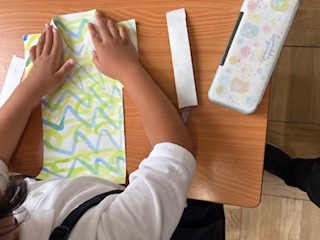 思い思いに色をぬったり、切った紙を貼って模様にしたり、工夫して自分のオリジナルのTシャツをつくることができました。