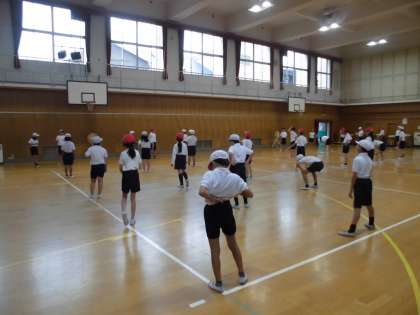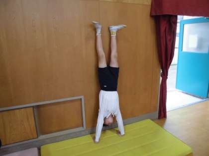 今日は雷のため、水泳学習ができなかったので、講堂で倒立の練習をしました。