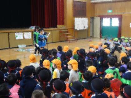 本日の2時間目、講堂で、1年生と幼稚園・保育所の子どもたちとの交流会を行いました。