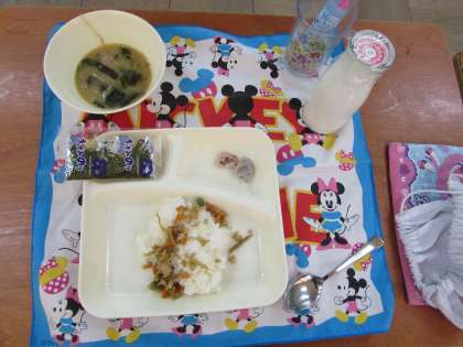 本日の給食の献立をご紹介します。本日の献立は、とりごぼうご飯、みそ汁、焼きれんこん、牛乳でした。