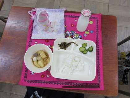本日の給食の献立をご紹介します。本日の献立は、ご飯、関東煮、あっさりきゅうり、茎わかめの佃煮、牛乳でした。