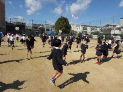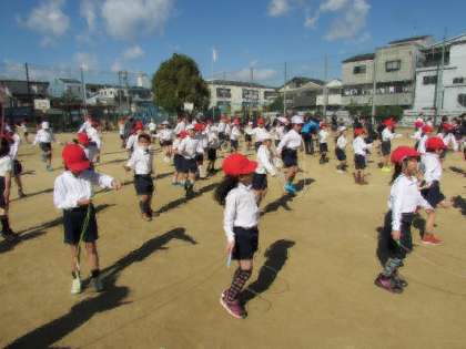 音楽に合わせて、前回し跳びや後ろ回し跳び、あや跳びなどに取り組みました。どの子も、それぞれ目標を持って取り組んでいます。